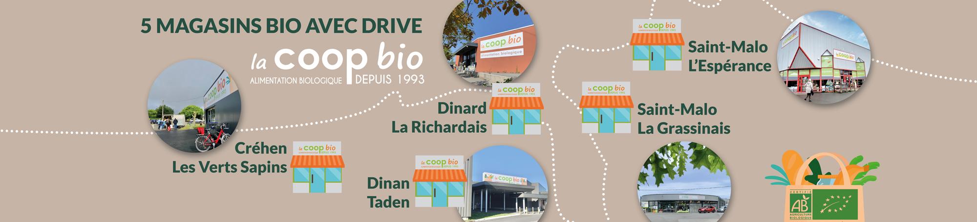 En plus de nos 4 magasins "La Coop Bio" basés à Saint-Malo, Dinard et Dinan, nous vous proposons de faire vos courses en ligne et de venir les récupérer au magasin de Saint-Malo - La Grassinais. Puis, en 2023, vous pourrez les récupérer sur nos autres magasins, nous y travaillons.