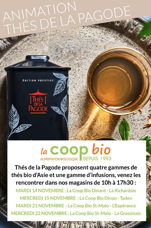 Thés de la Pagode proposent quatre gammes de thés bio d’Asie et une gamme d’infusions, venez les rencontrer dans nos magasins de 10h à 17h30 :