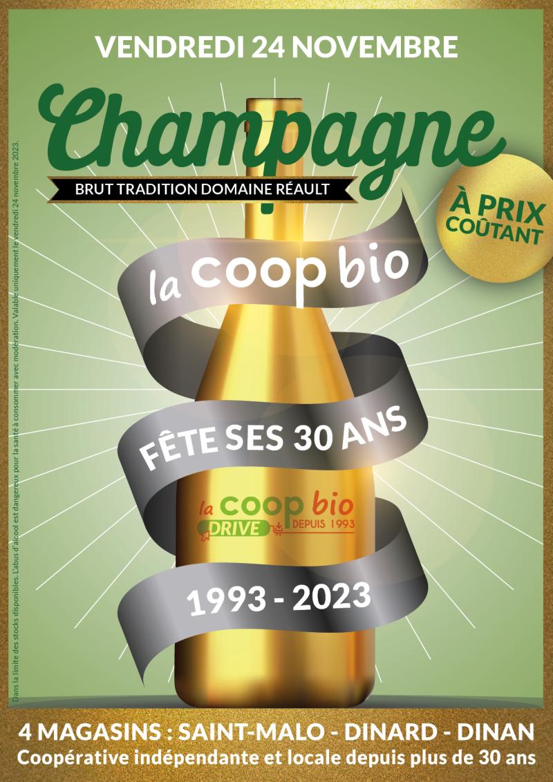 A l'occasion des 30 ans de La Coop Bio, prévoyez votre venue dans nos 4 magasins La Coop Bio pour le Champagne Brut Tradition Domaine Réaut à PRIX COUTANT le vendredi 24 novembre !