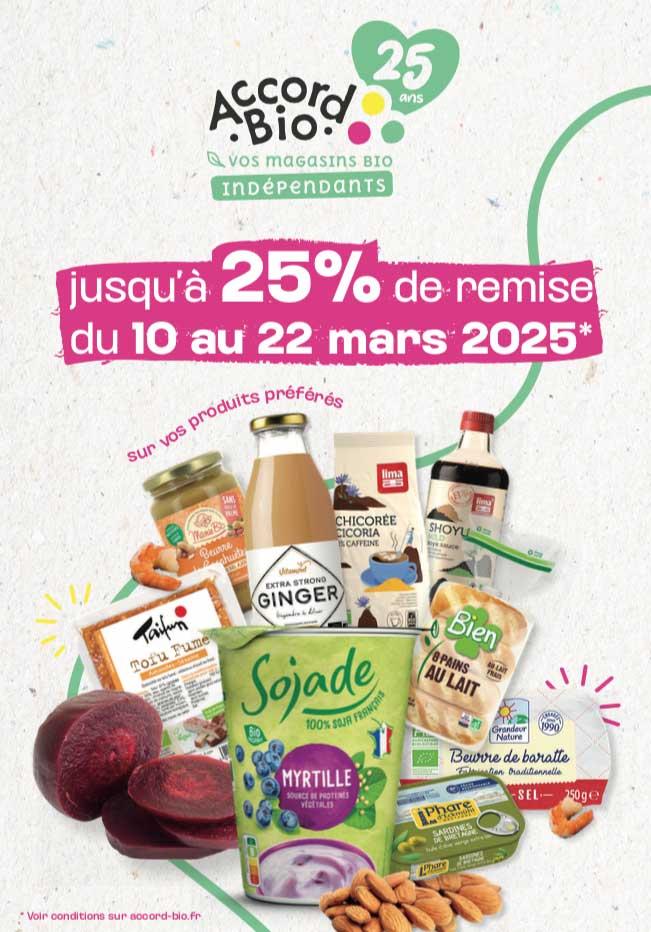 La Coop bio est adhérente de ACCORD BIO premier groupement de magasins Bio indépendants de France, une vraie force vive ! Pour les 25 ans d'Accord Bio, nous vous proposons des remises !