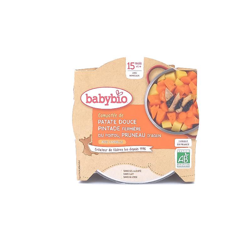 Assiette pour bébé aux patates douces de France, de pommes de terre du Centre-Val de Loire, de carottes françaises et de pruneaux d'Agen, avec de la pintade fermière du Poitou. Utilisation: ne pas mettre au four traditionnel. Au bain marie : plonger l'assiette environ 5 minutes dans l'eau bouillante, arroser d'eau froide, attendre un instant puis retirer l'opercule. Préparation rapide : percer l'opercule et chauffer environ 1 minute à puissance moyenne. Bien remuer et vérifier la température avant de donner au bébé. Ne pas ajouter de sel.
