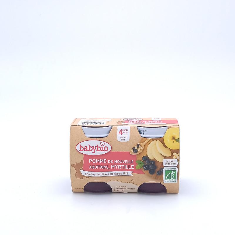 pot pour bébé à la pomme et myrtille, dès 4 mois. Sans sucres ajoutés, sans lait et sans gluten. Texture lisse.