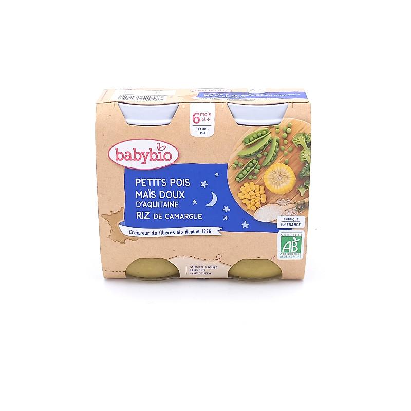 Pot bébé au maïs d’Aquitaine, avec des petits pois agrémenté de riz de Camargue et une pointe de thym. Précautions d'emploi: servir tiède, Ne pas ajouter de sel.