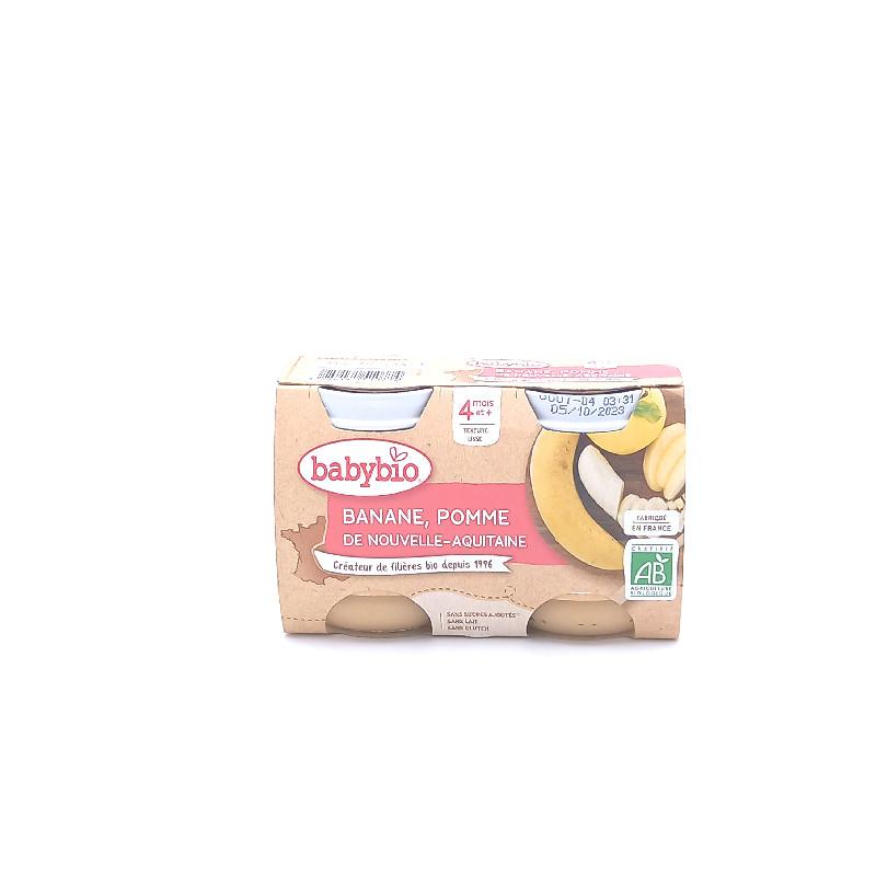 pot pour bébé à la pomme et la banane, dès 4 mois. Sans sucres ajoutés, sans lait et sans gluten. Texture lisse.