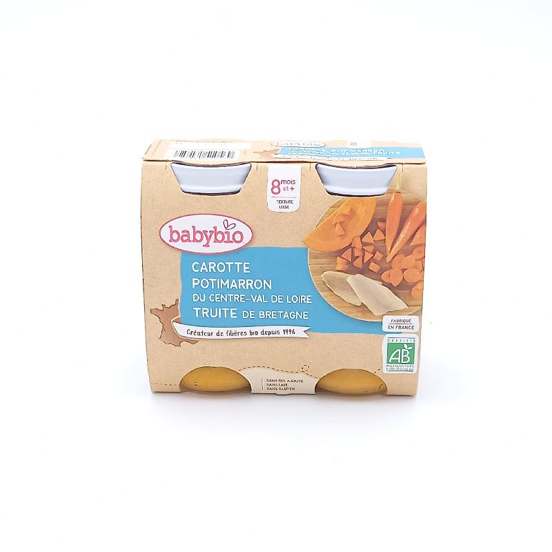 pot pour bébé à la carotte, potimarron, truite, dès 8 mois. Sans lait, sans gluten, sans sel ajouté et sans épaississant, Texture lisse.