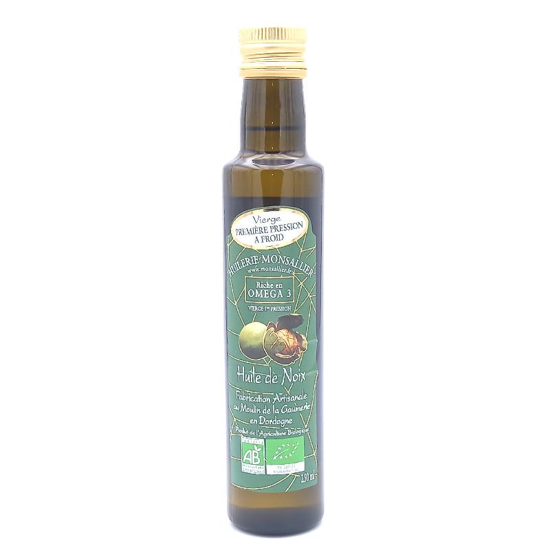 Riche en Oméga 3. Une huile douce, subtile et très légère. A consommer pour « se faire du bien », même seule sans vinaigre. Ne pas chauffer. Noix 100% Périgord. Fabriqué dans un atelier utilisant des noix, des noisettes, das amandes et du sésame