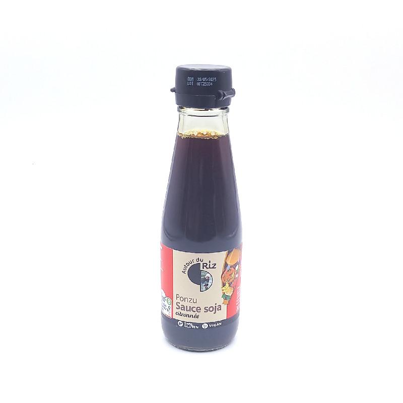 Sauce citronnée préparée à base de sauce de soja : Sauce tamari* 30 % (eau, soja* 21%, sel de gemme, riz*, ferment : aspergillus oryzae), eau, sucre de canne*, vinaigre de riz*, sel de gemme, extrait d'algue kombu royal*, citron vert* 2,81 %.
