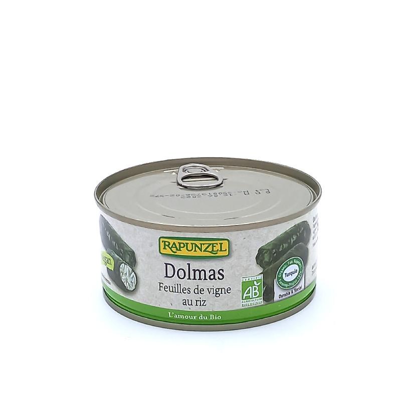 oignons*, riz cuit* (36,00%) (eau, riz*), feuilles de vigne* (17,00%), huile d'olive* vierge extra, sel de mer, aneth*, acidifiant : acide citrique, menthe*, poivre noir*