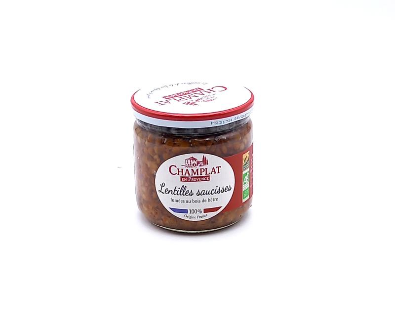 Lentilles et saucisses fumées pur porc issues de l'agriculture biologique française. Cuisinées à la marmite dans le Gard. Une recette simple et savoureuse, prête en un instant.