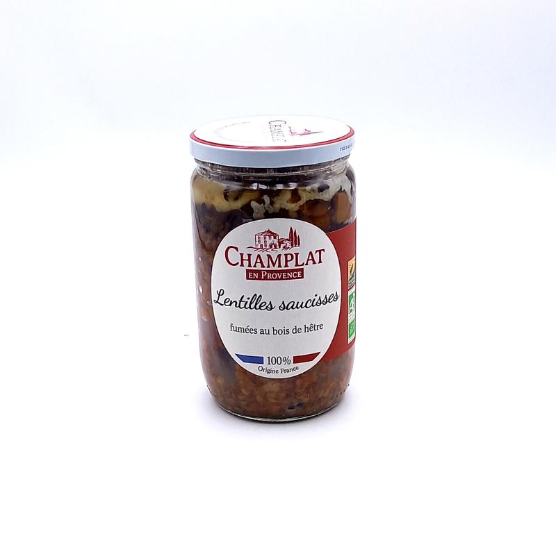 Lentilles et saucisses fumées pur porc issues de l'agriculture biologique française. Une recette simple et savoureuse, prête en un instant. Cuisinées à la marmite dans le Gard.