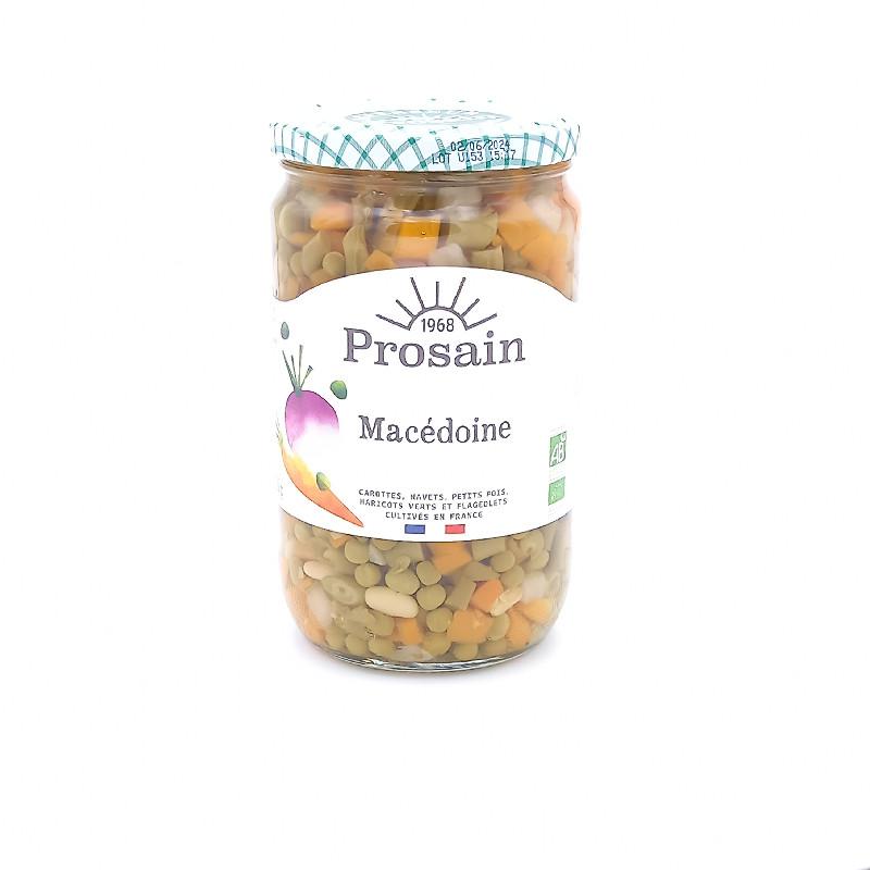 Recette incontournable de la cuisine française, notre Macédoine bio associe un savoureux mélange de légumes 100% français. Petits pois, haricots verts, carottes, navets et flageolets verts sont tous sélectionnés avec soin pour leur qualité et leur saveur, puis sont préservés en bocal en verre dans notre conserverie des Pyrénées-Orientales.