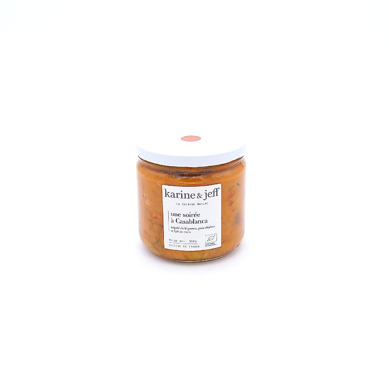 tomates* (24%|orig. France), carottes*(19%|orig. France), courgettes* (19%), poivrons rouges* (9,6%), lait de coco* (9,6%|extrait de noix de coco*, eau), pois chiches* (7,7%|orig. Sud-Ouest), oignons* (4,8%), raisins secs*, huile de tournesol premie?re pression a? froid* (orig. Sud-Ouest), sel de Guérande garanti Nature & Progrès, curcuma*, coriandre*, sarriette*, thym*.