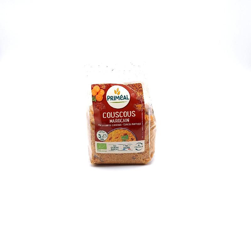 Ce couscous marocain parfumé en épices et aromates apporte toutes les saveurs et les couleurs de l'orient dans votre assiette. Composé de semoule de blé complet et de pois chiche, il se consomme chaud en plat d'accompagnement. Riche en fibres