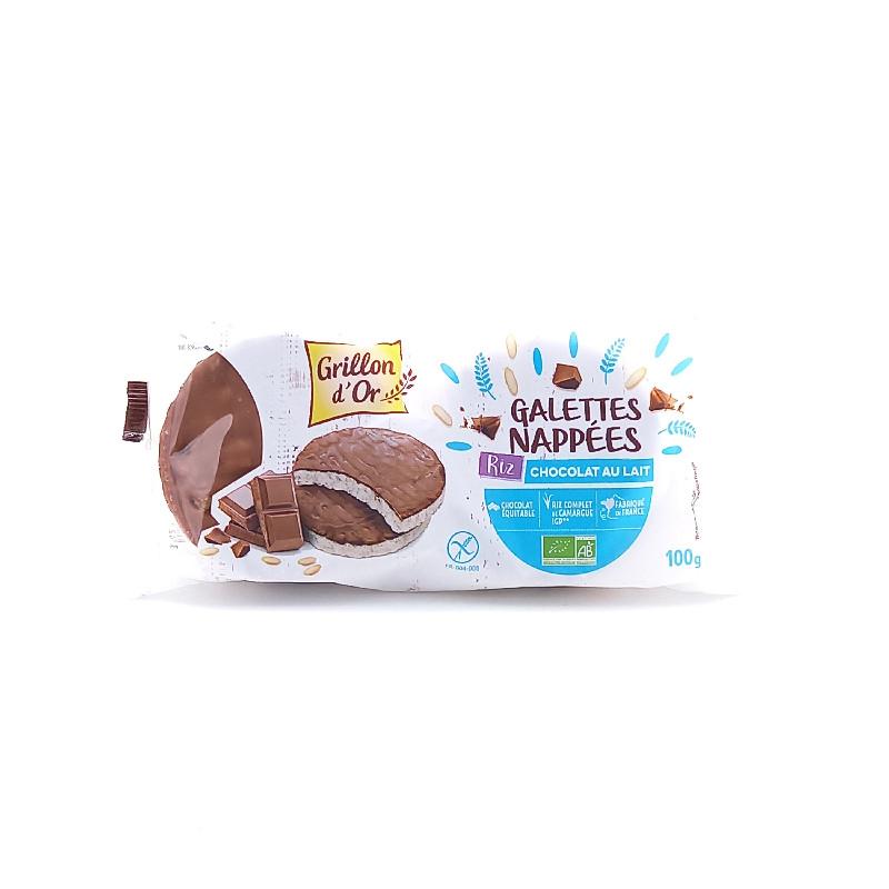 Galettes de riz certifiées sans gluten, nappées de chocolat lait. Au riz complet de Camargue et au chocolat équitable.