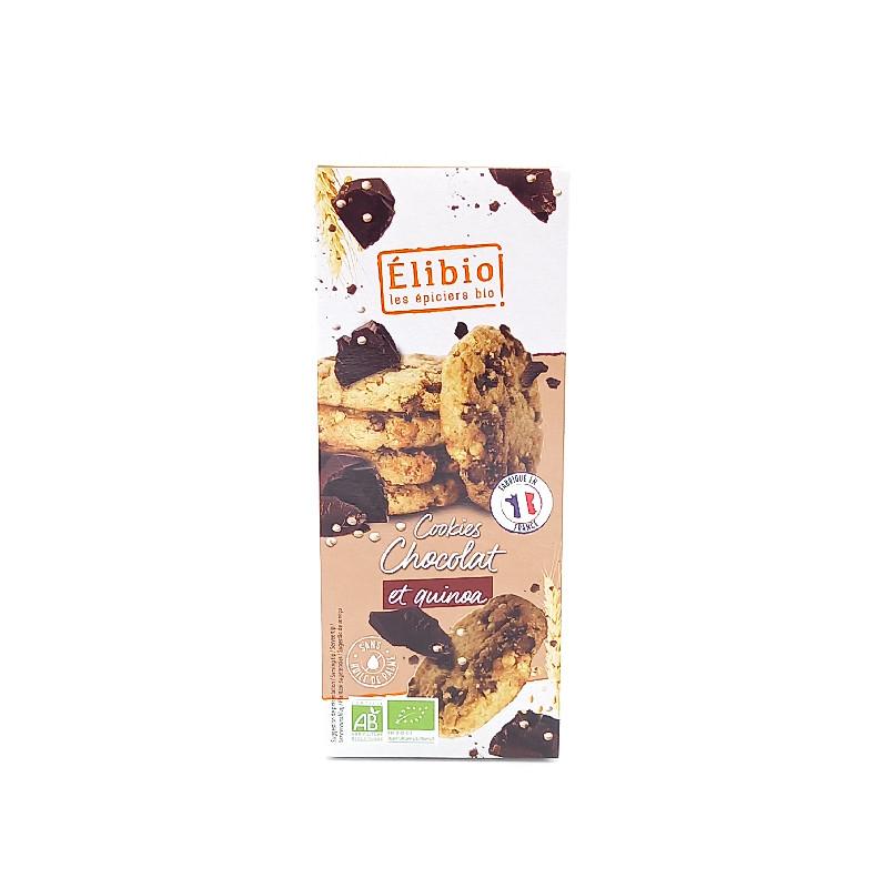 Farine de blé*, pépites de chocolat* 21% (sucre de canne*, pâte de cacao*, beurre de cacao*), sucre de canne*, huile de colza*, billettes de quinoa* 5% (quinoa* 2,5%, riz*), farine de quinoa* 3%, oeufs en poudre*, émulsifiant: lécithines (soja)*, poudre à lever: carbonates d’ammonium, sel marin, arôme naturel de vanille, poudre de lait écrémé* - *issus de l’agriculture biologique
