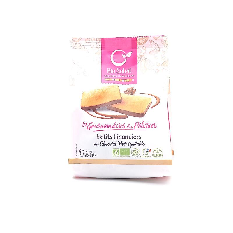 Recette pur beurre contenant 16% de poudre d'amande. Oeufs, beurre et farine d'origine France. Sucre et chocolat issus du commerce équitable. Ils sont parfaits pour une pause gourmande, et accompagnent idéalement le café. Sachet en papier recyclable contenant 8 sachets fraicheur individuels. Ces pâtisseries sont fabriquées en France (Rhône-Alpes) par des Artisans du métier.