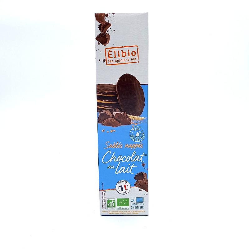 Venez découvrir les Sablés Nappés Chocolat au Lait de la marque Elibio, idéal pour le petit déjeuner et le goûter.