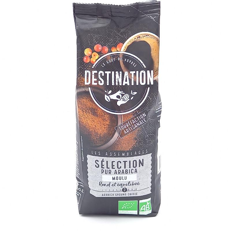 Le café moulu Sélection pur arabica de Destination est le fruit de l'assemblage de différents crus bio d'Amérique Latine, torréfiés un à un à Bordeaux selon la méthode dite "robe de moine". Rond, il offre une tasse équilibrée aux notes légèrement grillées.