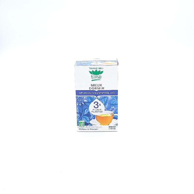 Concentration de plantes bio et préparation aromatisée pour infusion : Infusé concentré de mélisse bio, infusé concentré de verveine bio, passiflore bio, mélisse bio, tilleul bio, huile essentielle doranger bio sur support bio (inuline dagave bio, farine de chicorée bio), aubépine bio