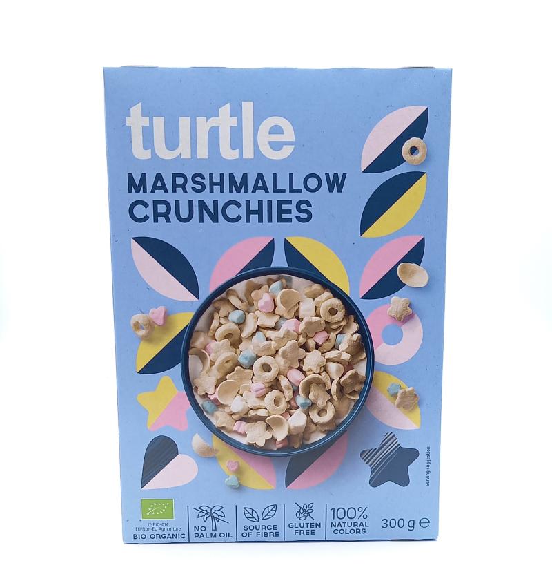Découvrez les Céréales d'avoine et riz avec marshmallows de Turtle, de délicieuses céréales croustillantes et arômatisées à la vanille avec des marshmallows croquants, idéales pour retomber en enfance et bien démarrer la journée. Réalisées avec des ingrédients issus de l'agriculture biologique, sans huile de palme et naturellement sans gluten.
