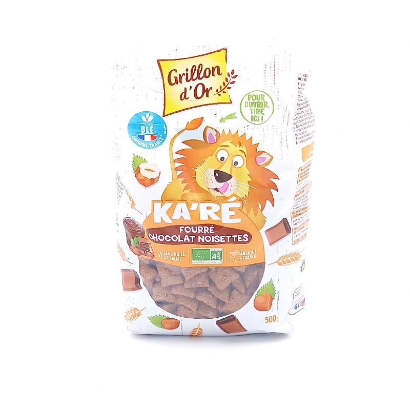 Pour tous les petits gourmands, Grillon d'Or a mis au point les Ka'Ré chocolat noisettes : un généreux coeur chocolat noisettes dans un biscuit croustillant aux 3 céréales (blé, maïs, avoine) pour un petit déjeuner 100% bio et Ka'ré'ment chocolat