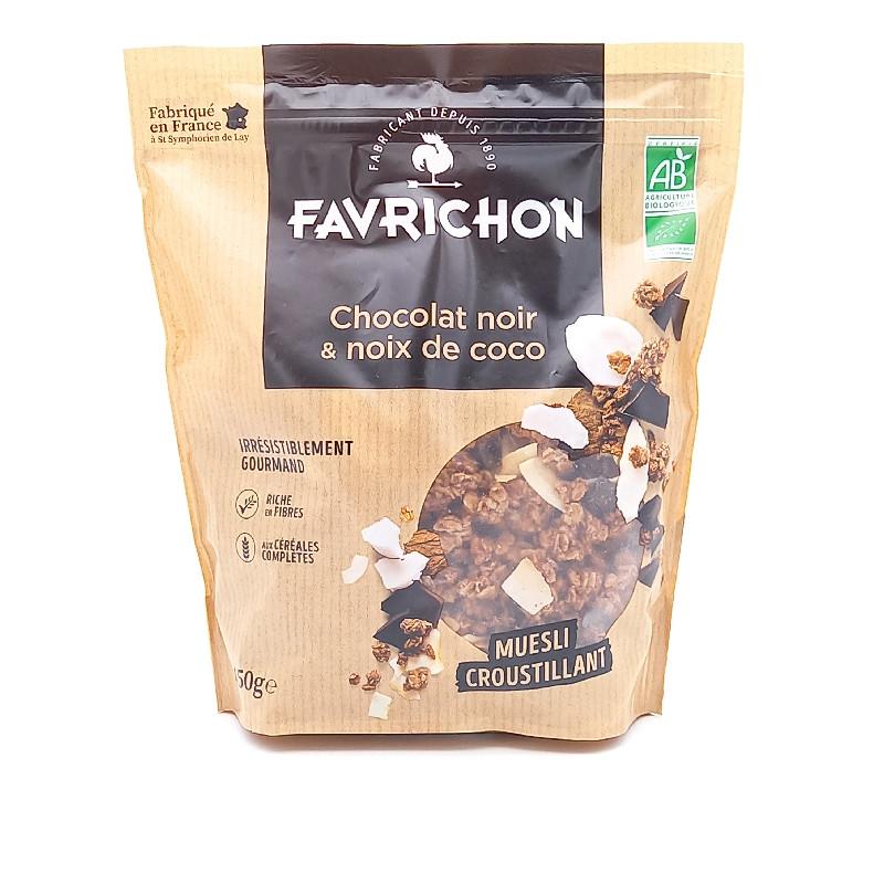 Découvrez ce délicieux muesli croustillant chocolat et noix de coco bio de la marque Favrichon.