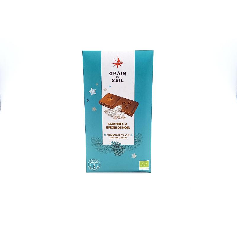 Sucre de canne*, beurre de cacao*, cacao*, poudre de lait entier*(14,6%), amandes hachées grillées*(10%), poudre de lait écrémé*(6,2%), mélange quatre épices*(1,5%) (cannelle*, gingembre*, muscade*, girofle*), émulsifiant : lécithine de tournesol*, fleur de sel, poudre de vanille* * Ingrédient issu de l'agriculture biologique. Cacao : 45% minimum dans le chocolat au lait Allergènes : Peut contenir des traces de sésame, d'arachides, fruits à coque et de céréales contenant du gluten.