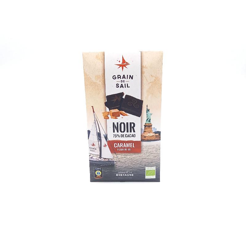 cacao*, sucre de canne*, éclats de caramel* (sucre*, sirop de glucose* (12%)), beurre de cacao*, fleur de sel (0.2%), émulsifiant : lécithine de tournesol*.