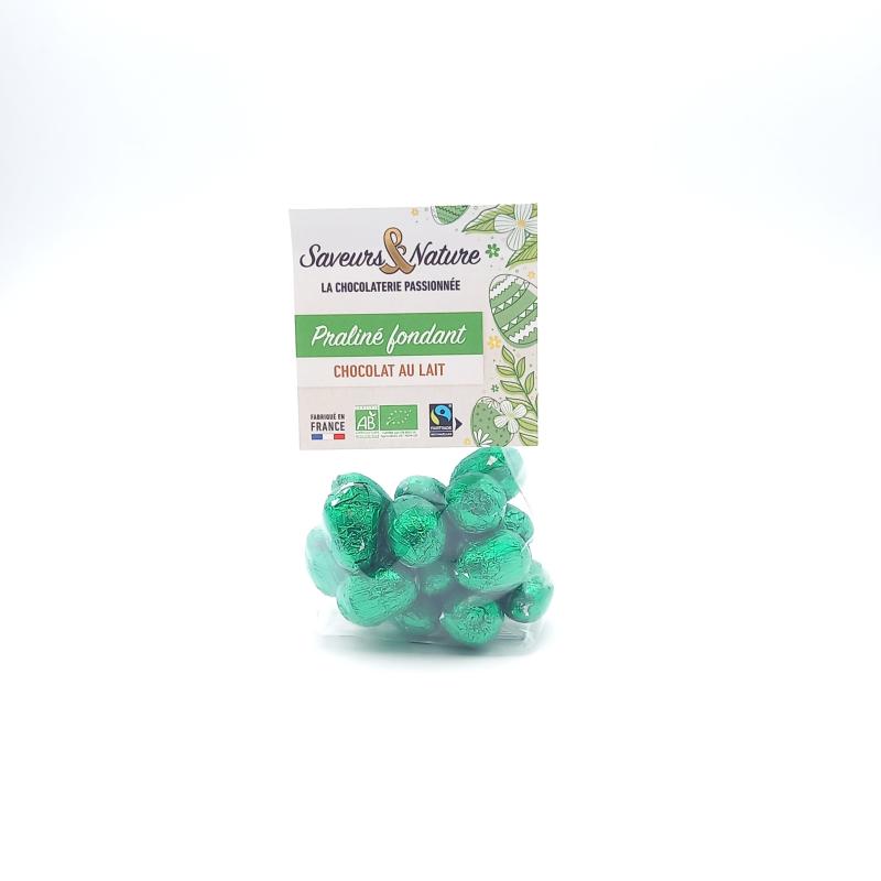 chocolat au LAIT* (sucre de canne*, beurre de cacao*, poudre de LAIT entier*, pâte de cacao*), praliné NOISETTE* : 38% (NOISETTES* : 19%, sucre de canne*),