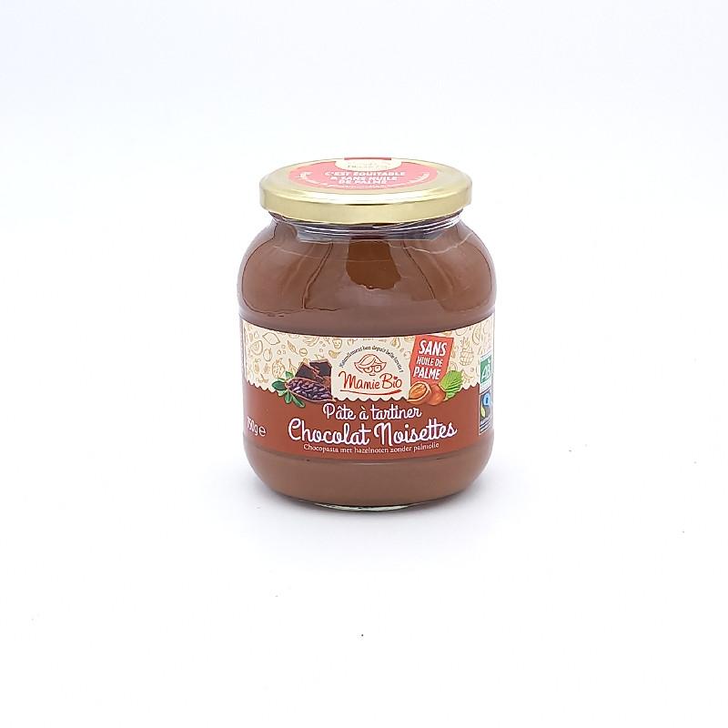 Découvrez la Pâte à tartiner noisettes et cacao, Mamie Bio en pot de 750 g.