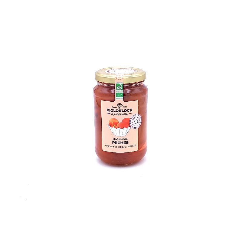 Nos pêches au sirop, 100% françaises, sont divisées en quartiers et conditionnées dans un bocal en verre recyclable de 350 grammes.