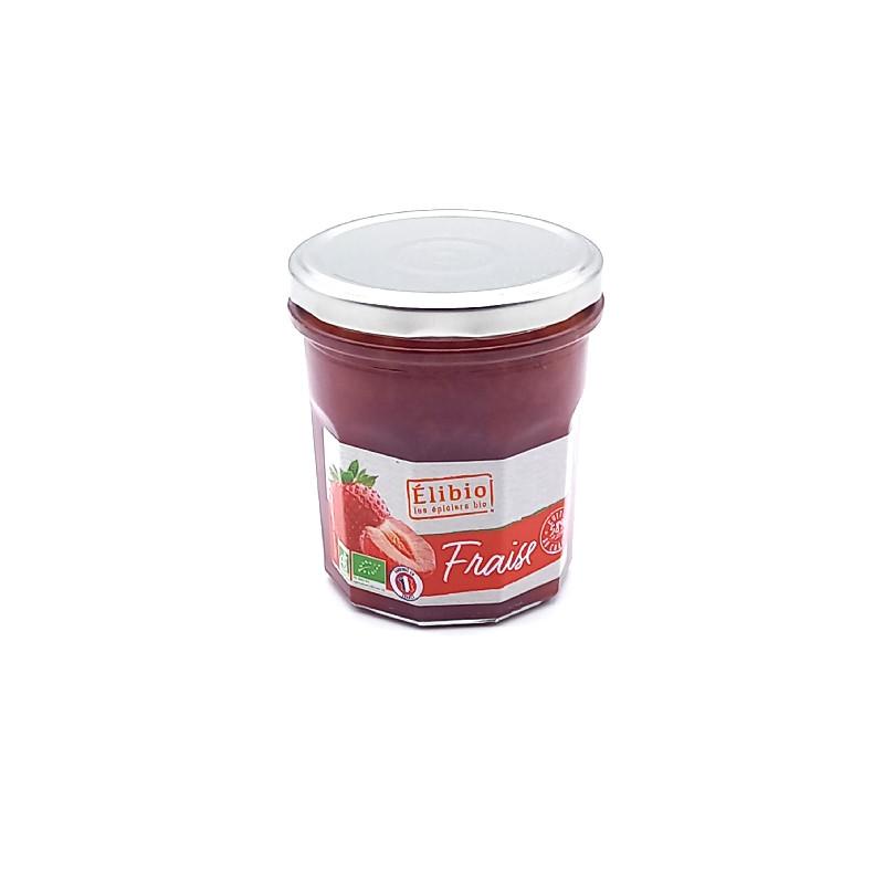 Fraises* 45%, sucre*, pommes* 13%, gélifiant: pectines, jus de citron concentré*. *issus de l’agriculture biologique