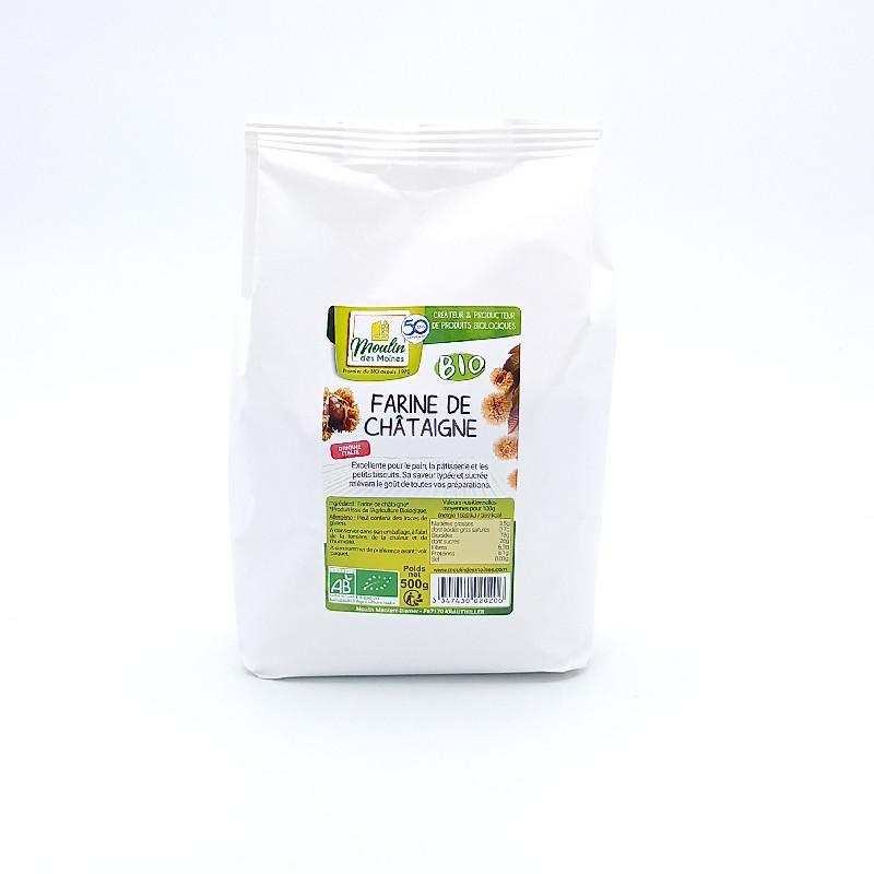 Elaborée avec des châtaignes bio séchées et broyées, la farine Moulin des Moines présente une saveur lègèrement sucrée et rustique.
