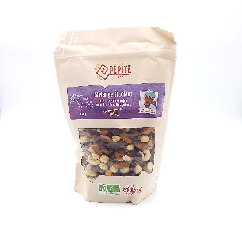 Un mélange Etudiant original, avec ses noisettes légèrement toastées pour en faire ressortir le goût, amandes et noix de cajou croquantes et qui s’associent particulièrement bien avec le raisin sucré. Un bon équilibre entre fruits à coques et raisins, avec plus de 60% de fruits à coques!
