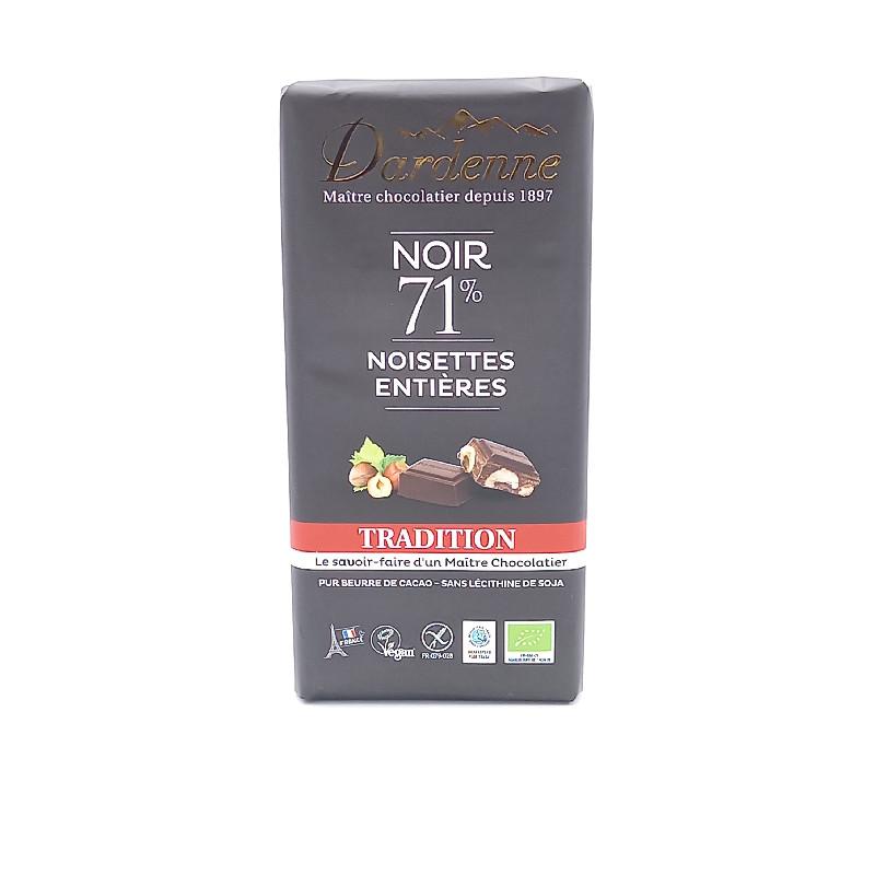 Une tablette grand format avec des carrés épais, gourmands et généreux avec 30 % de noisettes entières. 100 % bio, sans gluten afdiag, végan. Cacao et sucre Fair Trade. Sans soja, sans huile de palme, sans sel ajouté.
