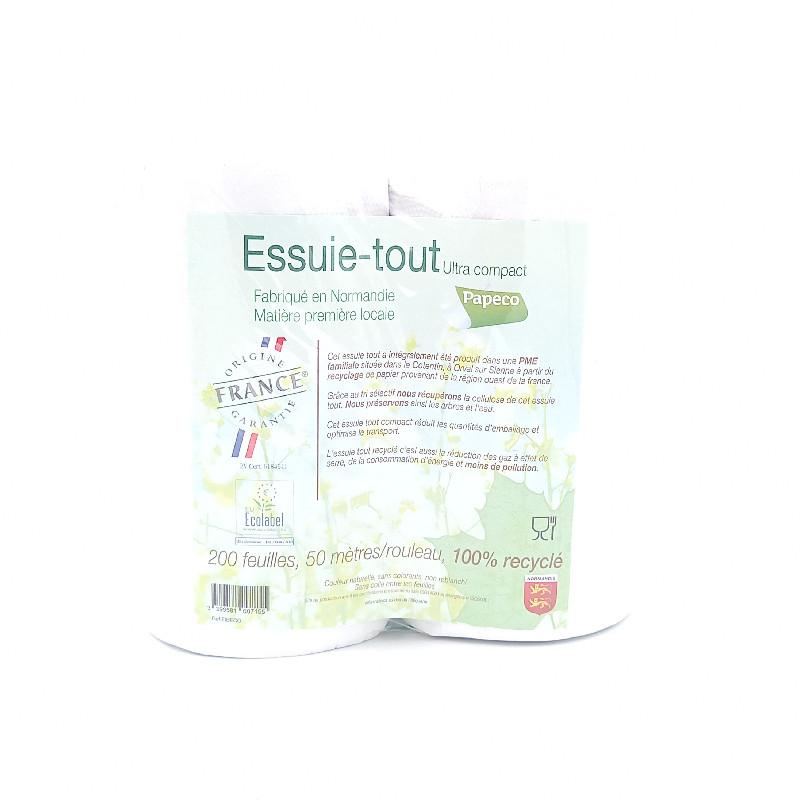 essuie tout recyclé, l'essuie tout 100% français, naturel et recyclé pour un produit responsable, qualitatif et au prix juste. Contenance : 2 rouleaux de 200 feuilles. Fabriqué à partir de papier recyclé en provenance de Bretagne et Normandie