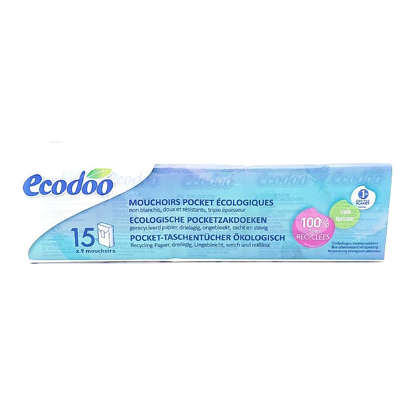 Mouchoirs pocket écologiques. 100% fibres recyclées. 15 étuis de 9 mouchoirs.
