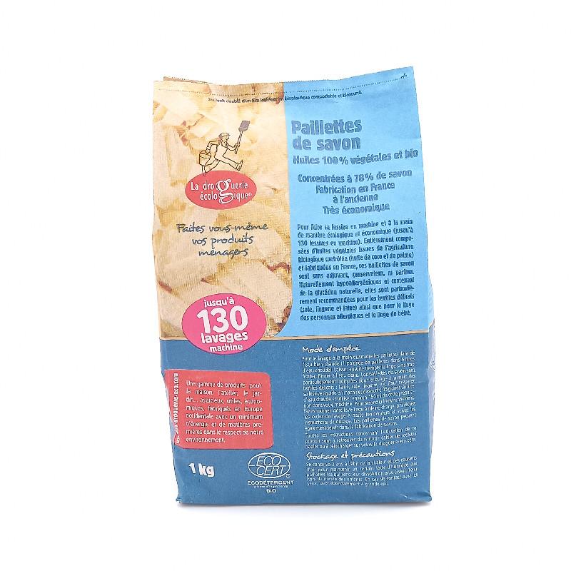 Les paillettes de savon de La droguerie écologique® sont obtenues à partir de bondillons (en forme de nouilles) de savon fabriqués en France uniquement avec de la soude et des huiles végétales certifiées bio de palme et de coco. Les molécules du savon sont amphiphiles, ce qui donne à celui-ci la propriété de dissoudre les graisses lorsqu’il est utilisé avec de l’eau. La concentration du savon mis en sachet est de 72% en acide gras actifs (donc 28% d’eau). Les paillettes de savon concentré sont particulièrement efficaces, écologiques, hypoallergéniques et économiques pour de multiples travaux ménagers, faire sa lessive, son savon, etc…