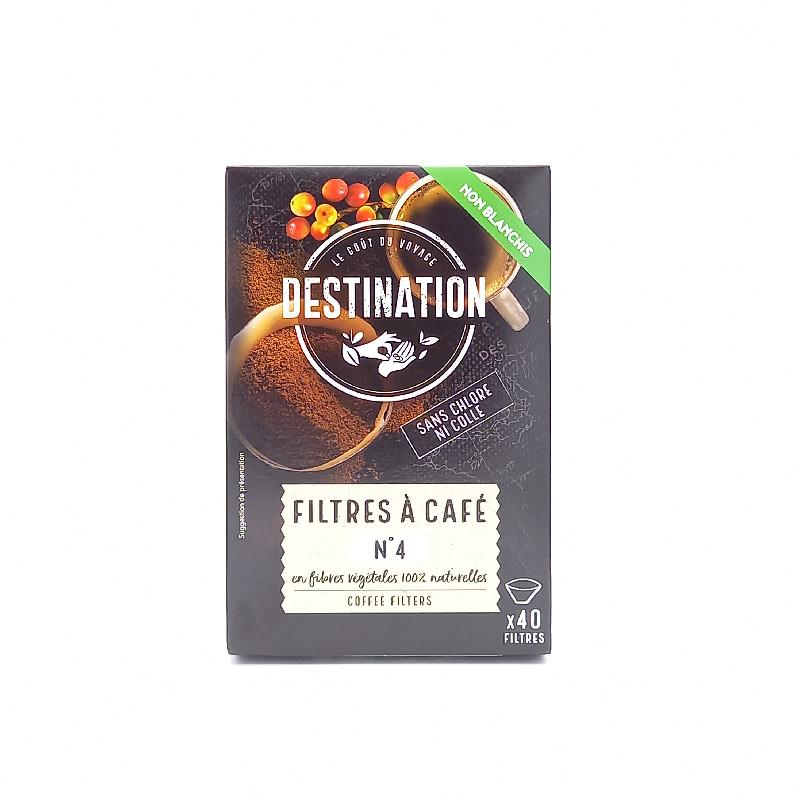 Lot de 40 filtres à café n°4 de la marque Destination. Ces filtres à café brun pour cafetières filtres sont élaborés sans chlore pour mieux respecter l'environnement. Ces filtres sont fabriqués exclusivement en cellulose, dont la soudure est réalisée par pression mécanique sans utilisation de colle, ni autre produit liant. Ainsi nous vous suggérons par exemple la remise en terre de votre filtre et son contenu.