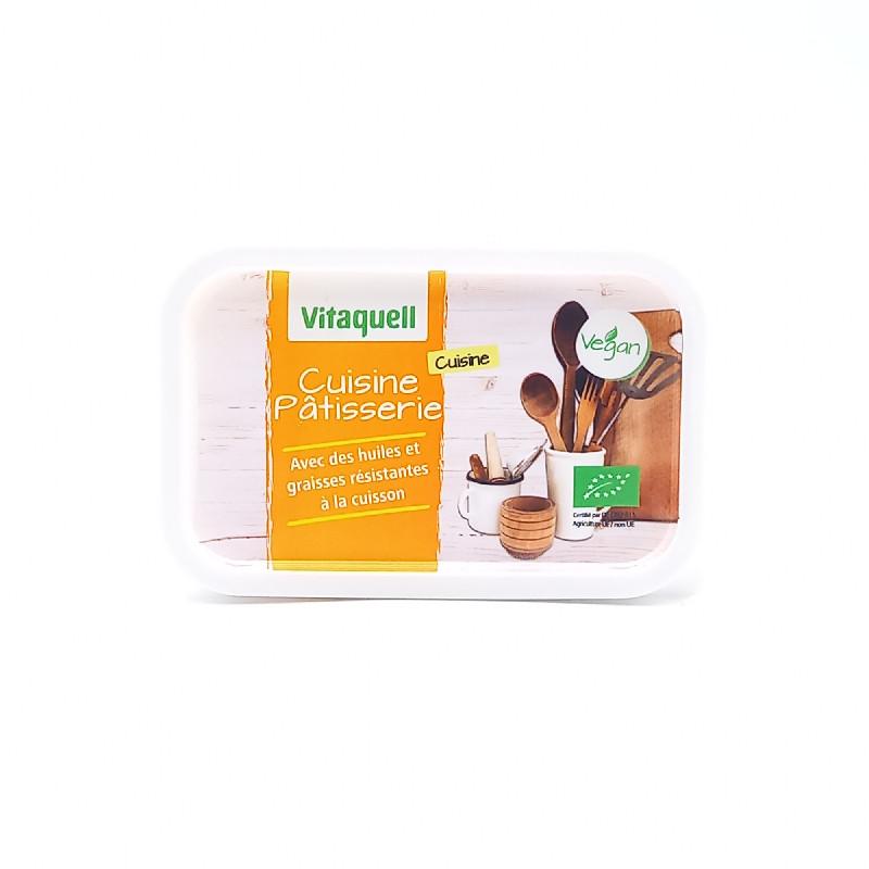 La margarine Cuisine-Pâtisserie de Vitaquell a été spécialement élaborée afin de résister à des températures élevées. Cette margarine contient une sélection rigoureuse de graisses bio naturellement solides dans la nature et présentant des caractéristiques indispensables pour être utilisées lors de la cuisson. Elles sont ensuite combinées, via un procédé de fabrication doux, afin d’obtenir la Cuisine-Pâtisserie de Vitaquell.