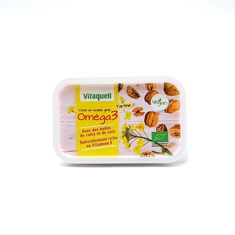 La margarine végétale Oméga 3 de Vitaquell contient 70% de matières grasses, et est fabriquée à base d’huile de colza et d’huile de noix. Elle est riche en acides gras oméga 3, est non hydrogénée et non esthérifiée.