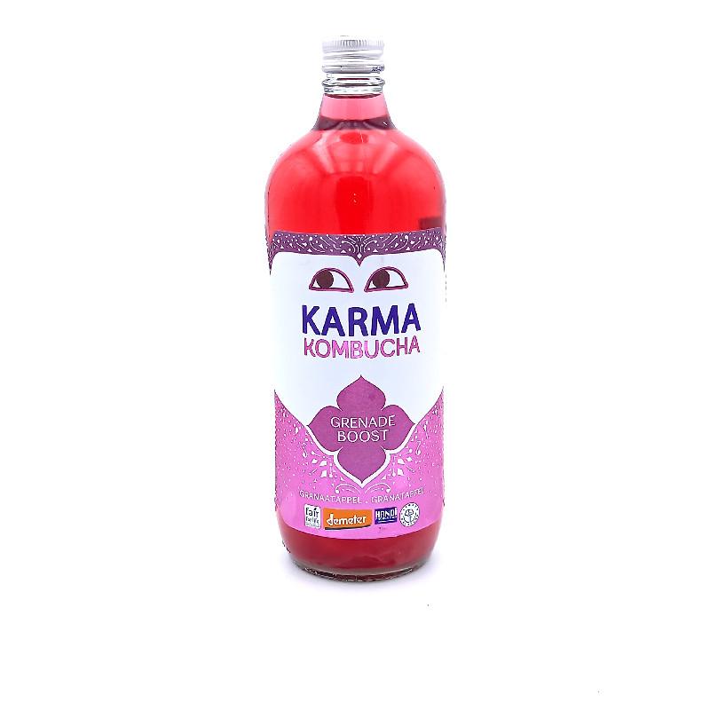 Découvrez le Kombucha grenade boost de Karma ! Une boisson naturellement gazeuse, pleine de probiotique, faible en sucres et en calories.