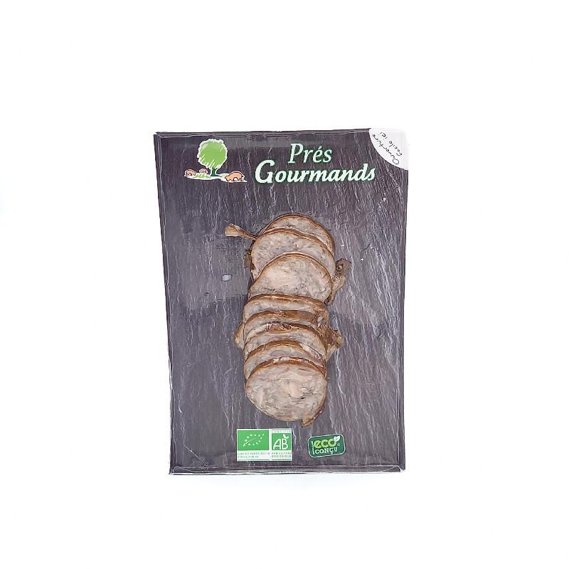 chaudins de porc, estomac de porc, viande de porc, couenne de porc, sel, enveloppe boyau naturel de bœuf, poivre, muscade; porc origine France fumé au bois de hêtre.
