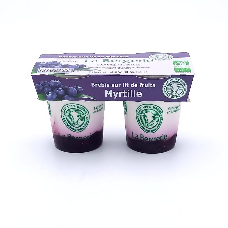 Lait de brebis pasteurisé*, myrtille* (9,6%), sucre de canne non raffiné* (7%), épaississants : amidon de tapioca* - pectine – farine de graines de caroube, arôme naturel*, correcteur d’acidité : citrate de calcium, ferments lactiques sélectionnés.