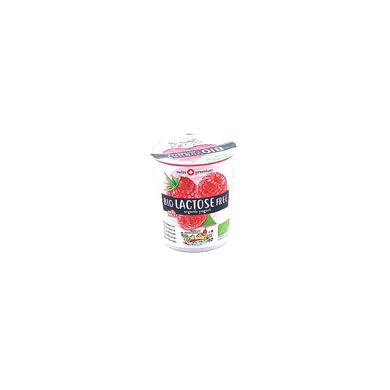 Yogourt avec framboises, sans lactose** (3,5% de matière grasse dans la partie lactique) Ingrédients : Yogourt sans lactose à base de lait pasteurisé*, framboises* (11%), sucre de canne brut*, lactase. Issus de l'agriculture biologique.