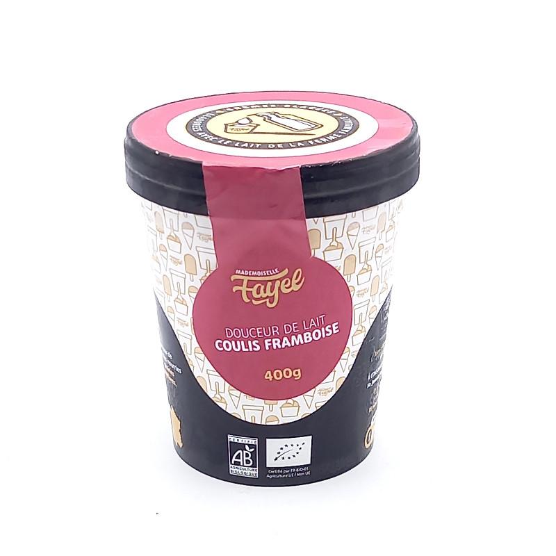 lait entier, crème fraiche, sucre de canne, sirop de glucose déshydraté. lait écrémé réhydraté, sirop de sucre inverti, stabilisant (gomme de guar, gomme de caroube). Émulsifiant (fibre et émulsifiant de soja) 9% coulis de framboise (framboise 70% sucre)