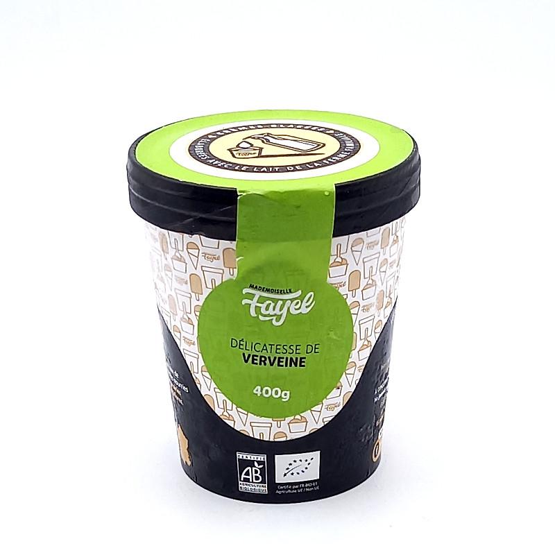 lait entier, crème fraiche, sucre de canne, sirop de glucose déshydraté, feuille fraiches de verveine, lait écrémé réhydraté, sirop de sucre inverti, stabilisant (gomme de guar, gomme de caroube) émulsifiant (fibre et émulsifiant de soja)