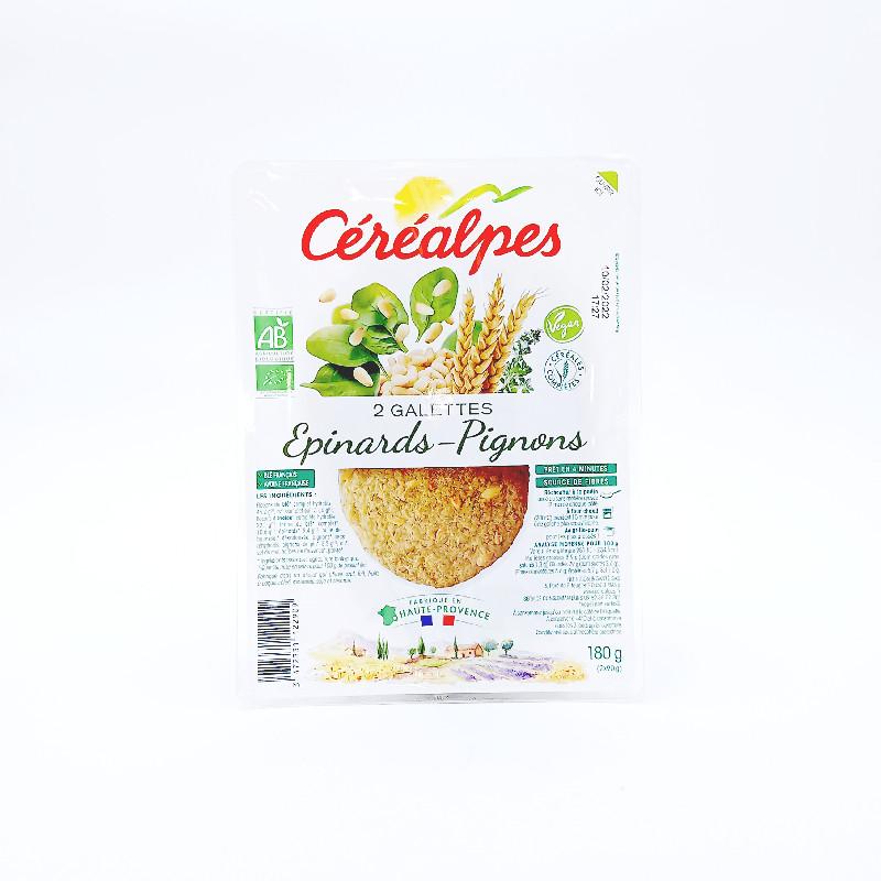 flocons de blé complet hydratés* 40 %, riz complet cuit* 31,2 %, flocons d'avoine complète hydratés* 20 %, farine de blé complet* 10,5 %, épinards* 9,3 %, oignons*, huile de tournesol désodorisée*, pignons de pin* 3,5 %, ail*, sel de mer, herbes de Provence*, poivre*.