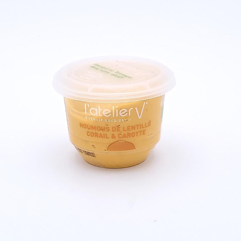 Lentilles de corail origine France 56%, carottes 14%, huile de colza, pâte de graines de sésame décortiquées, jus de citrons, huile d'olive, concentré (carotte, potiron eh pomme), sel marin, épices, plantes aromatiques