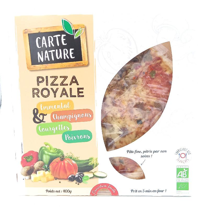 Garniture* 57%: sauce tomate* cuisinée 24 % (purée de tomate* , eau, oignons* , huile de tournesol*, sel de Guérande, persil*, basilic*, ail*, poivre*, origan*, herbes de Provence*), EMMENTAL* 13 %, champignons* 8,9 courgettes* 4,4 %, poivrons* 4,4 %, olives* 1 %, origan*. Pâte à pizza* 43 % : farine de BLE*, eau, levure boulangère* , sel, poudre à lever* (amidon de BLE*, bicarbonate de sodium, bitartrate de potassium).